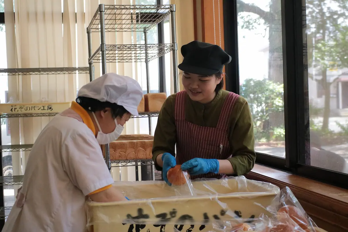 主な業務はパンの製造と販売です。それに加えて、「施設外就労」として島原の野菜卸売会社から委託された袋詰め作業の引率や、季節によってはイチゴの収穫・箱詰めなど、地域の依頼に応じた農作業のサポートにも携わっています。合間を見ては、販売戦略や今後の売上計画についても考えるなど、多岐にわたる業務に携わっています。